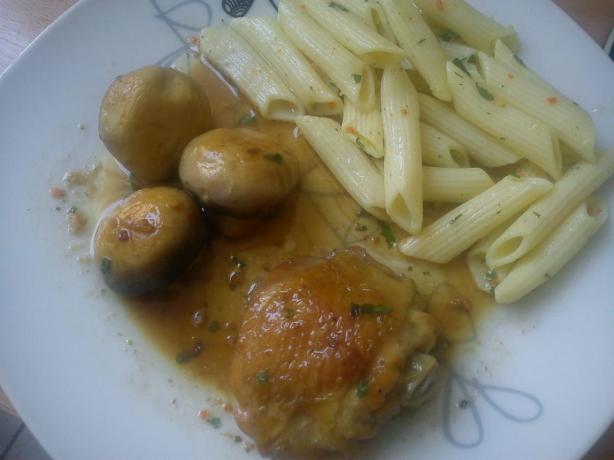Kad se malo izdinstju, vratimo piletinu u gljive i prelijemo bijelim vinom. Pustimo da malo ispari, pa jos samo malo jušne vode dodat i odma isključimo tako da se potpari. Tako dobije finu zlatnu boju sos.
