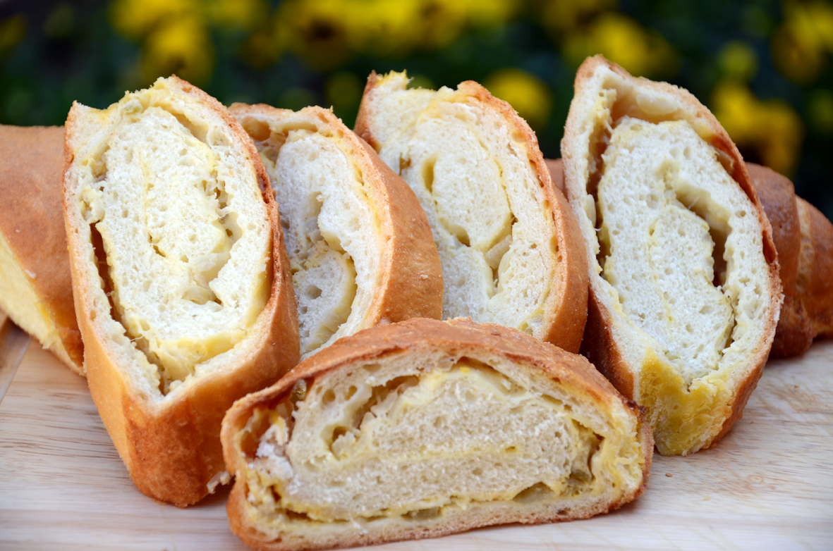 Žumanjke odvojite od bjelanjaka. U snijeg od bjelanjaka dodajte žumanjke, dobro izmješajte, pa tom mješavinom premažite tijesto i luk. Po želji posolite, a zatim po nadjevu rasporedite kockice maslaca. Zarolajte, stavite u tepsiju i pustite još kratko stajati. Pecite u pećnici zagrijanoj na 200°C 40 minuta.