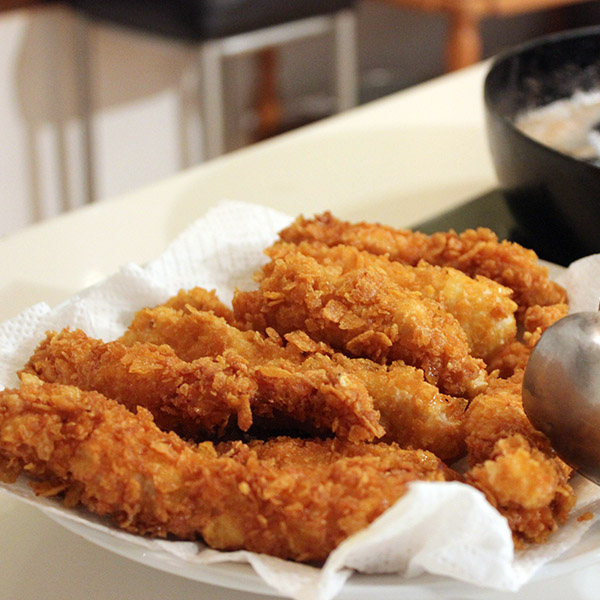 Pustiti da odstoji 20 min., te uvaljati brašno, zatim u umućena jaja i na kraju u smrvljeni cornflakes.
