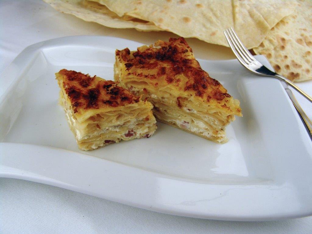 Posudu u kojoj ćemo peći mlince premažemo maslacem i slažemo jedan red mlinaca, jedan red nadjeva i to tako da svaki red mlinaca poškropimo uljem, a najgornji sloj posipamo ribanim sirom. Sve prelijemo slatkim vrhnjem i zapečemo 40 minuta u pećnici.