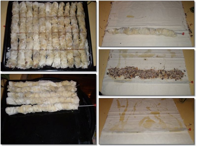 500 gr gotovih kora 1/2 maslaca 1 šoljiica ulja Sastojci za nadjev: 100 gr krupno mljevenih oraha 200 gr mljevenih badema 100 gr mjevenih lješnika 300 gr krupno rendane čokolade (za kuhanje - ili mliječna tvrda čokolada) Sastojci za šerbet: 500 gr šećera 500 ml vode Priprema: Uzeti jednu koru, poprskati mješavinom ulja i putra, staviti iglu za pletenje na 5 cm od početka kore i preklopiti . Preko preklopljenog dijela staviti nadjev, oko 2 kašike. Uz pomoć igle, motati koru, ali nemojte je zatezati prilikom motanja . Vrh igle nasloniti na ivicu tepsije i koru nabirati (gužvati) na iglu, a iglu polako izvlačiti. Slagati tako koru, po koru, jednu do druge. Ostatak maslaca preliti preko baklave, a onda baklavu isjecite na željenu veličinu. Staviti da se peče na 200 °C oko 20 minuta, dok blago ne porumene. U međuvremenu, skuhati šerbet sa kojim se prelije pečena baklava još dok je u tepsiji i ostavi se u njoj dok ne upije šerbet. Servirana baklava prelije se sa istopljenom čokoladom.  Select ratingProsječan receptDobar receptVrlo dobar receptOdličan receptIzvrstan recept Prosjek: 3.2 (+5) ‹ Rol baklava od oraha i čokolade najbolji recept