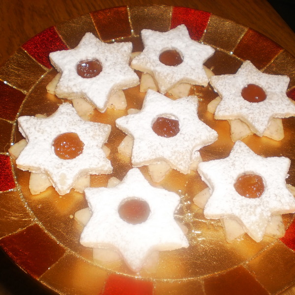 Zvjezdice s otvorom posuti šećerom u prahu,na cijelu zvijezdicu nanijeti marmelade i spajati ih.Smjesa je dovoljna za 30 komada.