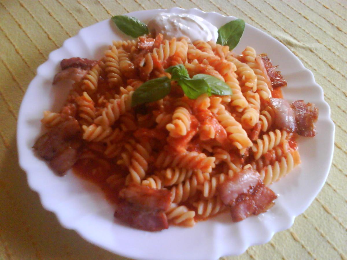 U tavu staviti žlicu maslaca, pa kad se rastopi staviti slaninu narezanu na listiće da pusti malo masnoće i preprži se. Češnjak usitniti pa dodati tek toliko da pusti miris. Pelate izmiksati štapnim mikserom, te dodati slanini i češnjaku. Kratko prokuhati, dodati začine po želji (sol, biber, bosiljak, vlasac), te staviti žlicu kiselog vrhnja. Još malo prokuhati. U međuvremenu ocijediti tjesteninu, te je umiješati u umak, sve zajedno promiješati. Servirati na tanjur i ukrasiti po želji kiselim vrhnjem, parmezanom, svježim bosiljkom, prepečenim listićima slanine.