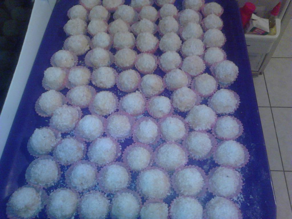 Bijelu čokoladu sam rastopila sa par žlica vode u mikrovalnoj i prelila preko svake kuglice,te sam posipala sa kokosom.Stavila u košarice i u frižider .