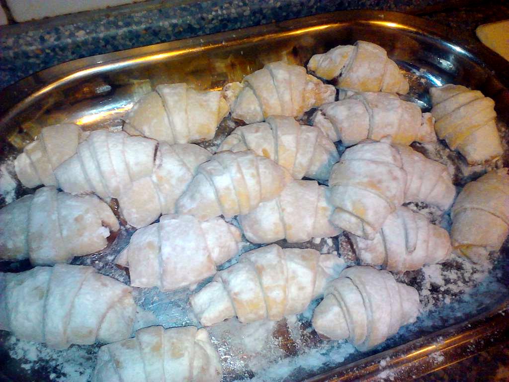 Razvaljati na tanko,u krug,te rezati na osmine il koliko želite da budu velike kiflice.