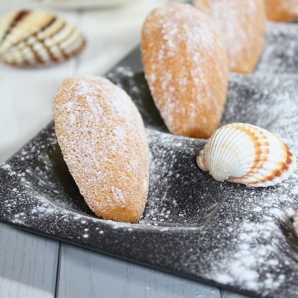 - Ukoliko kalup koji imate nije "nonstick" lagano ga podmažite otopljenim maslacem i pospite brašnom (višak brašna otresite) . Žlicom uzimajte gotovo tijesto i punite utore u kalupu za madeleinse. Nemojte ih sasvim popuniti, već do 3/4 modla. Pecite ih oko 8 minuta , posebno ako imate "nonstick" (neljepljivi) kalup ili najviše do 10 minuta ako volite da madelein kolačići budu malo više zlatne boje. Pečene kolačiće izvadite i ohladite na tanjuru obloženom kuhinjskim papirom. Po želji ih pospite šećerom u prahu.