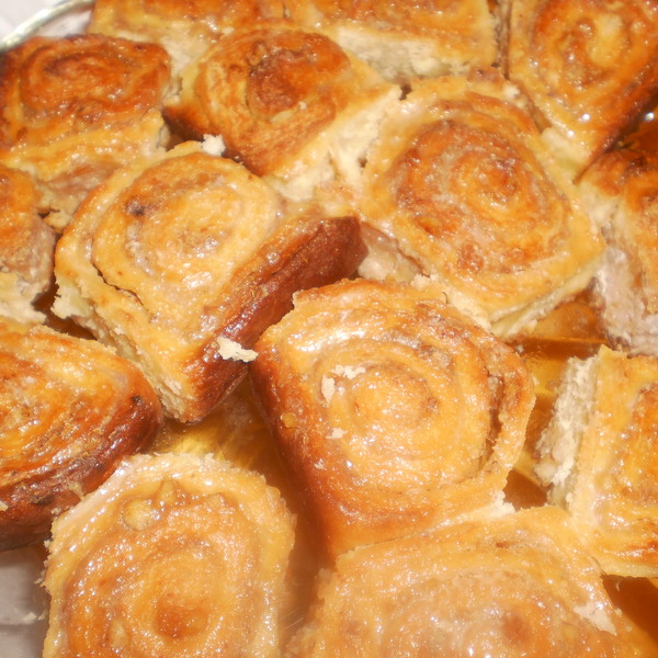 Tijesto koje ste tri puta premazali i razvaljali,nakon što je odstajalo ponovo razvaljajte i premažite rastopljenim maslacem,premažite marmeladom,pospite šećerom, orasima, grožđicama i smotajte u roladu.Režite na kolutove oko 1 cm debljine i slažite u namazan pleh,jedan kraj drugog.Ostavite da se tijesto digne.Pecite u pećnici na 180 °C do zlatno rumene boje.