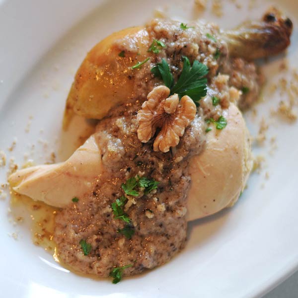 Pile očistite, dodajte sol, papar i stavite ga u vatrostalnu zdjelu. Dodajte vode, pokrijte i pecite nešto manje od sat vremena. Pile razrežite i složite na tanjure.... Maslac i brašno zažutite, dodajte mljevene orahe, češnjak, i sok od pečenja. Umak prokuhajte, prelijte po narezanom pilu. Stavite još peći 10 tak minuta da se dobro zapeče.