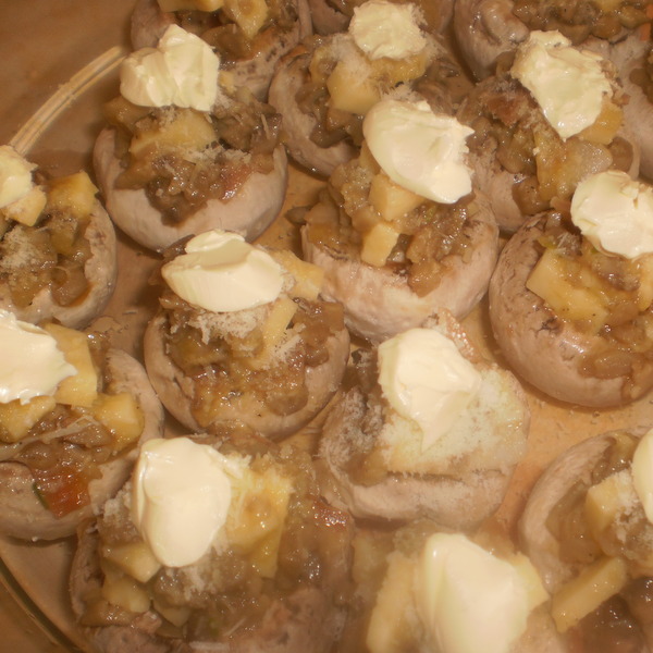 - Pred kraj dodati sol, papar i češnjak.Kad se smjesa ohladi u nju dodati 1 jaje,pršut i obje vrste sira. Tom smjesom puniti klobuke i slagati u posudu na malo ulja.Preko punjenja posuti još parmezana,a na vrh staviti malo maslaca.