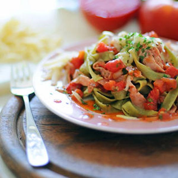 Na zagrijanom ulju popržite šunku narezanu na rezance. Dodajte oguljene i na komade narezane rajčice i zajedno pirjajte oko 10 minuta, a zatim dodajte pire od rajčice razrijeđen sa 1 dl juhe ili vode. Posolite, popaprite i zajedno kuhajte kratko vrijeme a zatim dodajte kosani peršinov list. U međuvremenu rezance skuhajte u dosta posoljene kipuće vode i ocijedite. Zatim ih istresite na zagrijano ulje i promiješajte da se ravnomjerno naulje. Prelijte ih smjesom od šunke i rajčice te lagano izmiješajte. Tada jela istresite u dublju zdjelu i pospite naribanim trapistom ili trapist poslužite posebno.