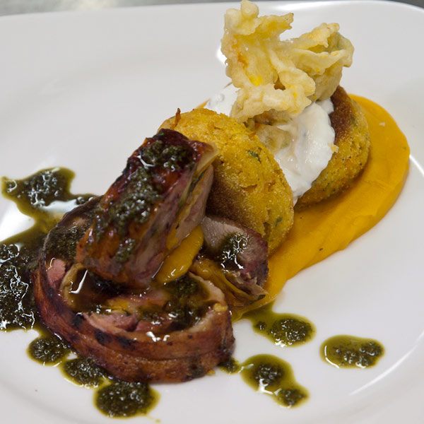 I na kraju na tanjur složimo polpete od buče, prekrijemo odrescima pačje rolade te zalijemo pestom od bučinog ulja.