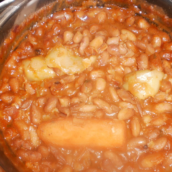 Kad je grah skoro pred kraj kuhan(treba se cijelo vrijeme kuhati u malo vode),dodati pešt,malo koncentrata rajčice,po potrebi dosoliti i popapriti i staviti u pećnicu na 200° da se dovrši.Višak vode će ispariti,a okusi se pomiješati.